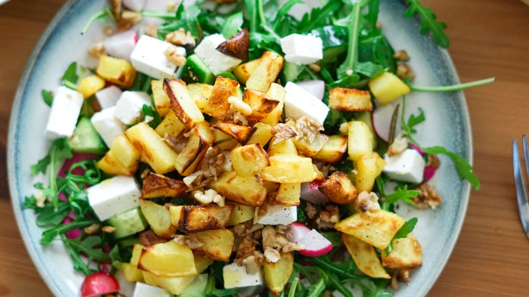 Bratkartoffelsalat mit Weiße-Bohnen-Roterüben-Dip