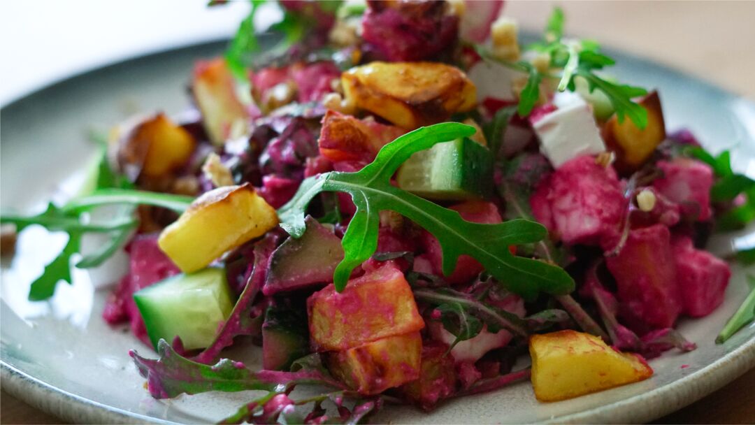 Bratkartoffelsalat mit Weiße-Bohnen-Roterüben-Dip